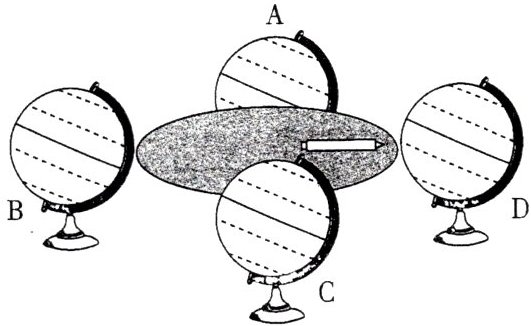 用剪刀将卡纸剪成椭圆形,放在桌上,用书本垫高,高度和地球仪的球心高度接近;将1支颜色鲜艳的笔放在椭圆形卡纸上,代表太阳直射光线照射的情形;将4个小型地球仪摆放在地球公转的四个主要节气所在的位置,模拟地球公转的不同位置(如下图所示)。