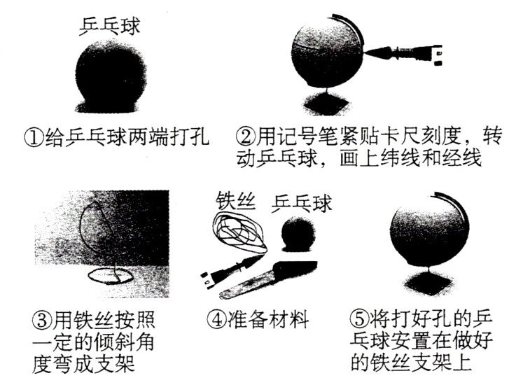 (2025河源期中改编)地理活动课上,老师带领同学们利用乒乓球和铁丝制作简易地球仪,制作过程如下图。读图,完成5~7题。