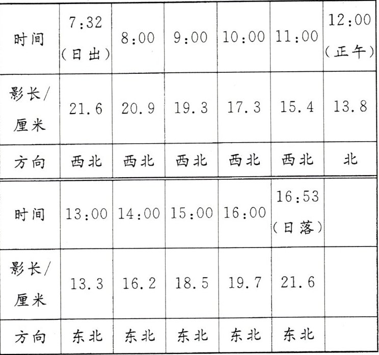 实验过程:将小木棒竖直放在开阔的操场上并用橡皮泥固定,从日出开始,每整点时间测量小木棒影子长度及方向。下面是实验小组记录的影子长度及方向(北半球)统计表。