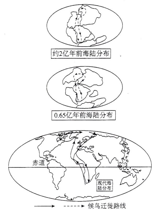 (2) 在现代海陆分布图中,候鸟迁徙()