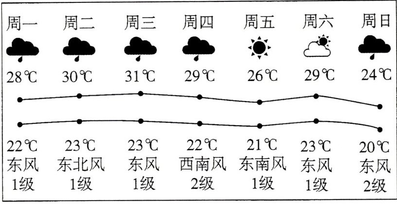 天气影响人们的生产和生活,天气预报可以让人们及早了解未来天气。下图为成都某一周的天气预报示意图。
