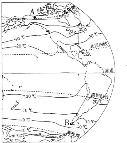 在某影片中,故事主人公们于阿拉斯加(图中A处)会合,开始了他们的美洲穿越计划。他们从北极圈出发,一路向南,以阿根廷最南端(图中B处)为目的地。下图为世界局部地区年平均气温分布图。