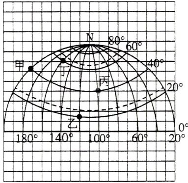 小雨是围棋爱好者,她在课后学习围棋时突发奇想——将围棋棋盘改造成“地理经纬网”,在棋盘上以某一点为极点,绘制出简易经纬网,有几个棋子恰好落在其所绘制的几条经纬线上(如下图)。据此完成(1)~(2)题。