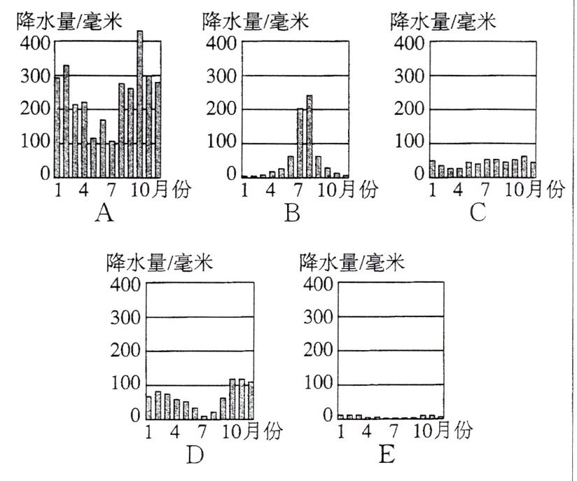 (2)把材料一中各城市名称和代表降水量柱状图的字母填入下表。