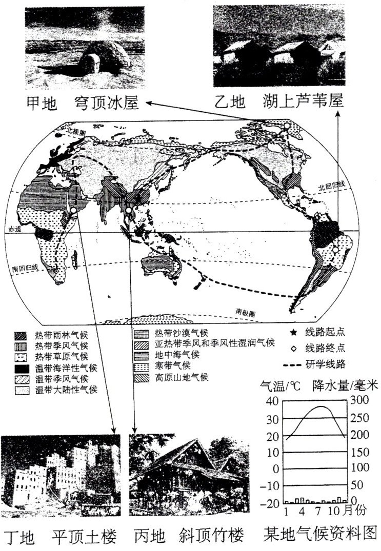 传统民居是人类顺应自然环境的体现。下图为某校开展的寻访传统特色民居研学线路图。读图,完成5~6题。