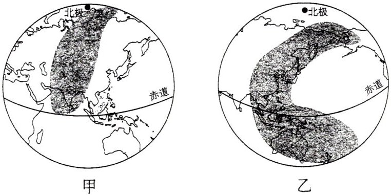 (2025滨州模拟)候鸟是指每年在越冬地和繁殖地之间进行迁徙的鸟类。候鸟迁徙与气候变化、日照时长、食物等因素密切相关。下图为甲、乙半球图(阴影示意候鸟迁徙路线范围)。据此完成1~2题。