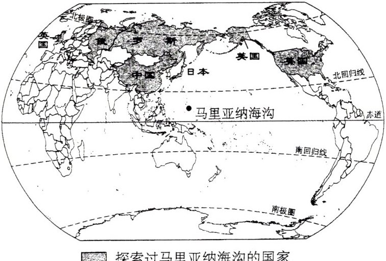 (2025德州模拟)马里亚纳海沟深达11 034米,号称“世界第四极”,下图为探索过马里亚纳海沟的国家分布示意图。读图,完成3~4题。