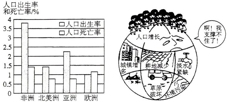 下面为四大洲人口出生率和人口死亡率统计图及漫画《地球在呻吟》。读图,完成 4~5 题。
