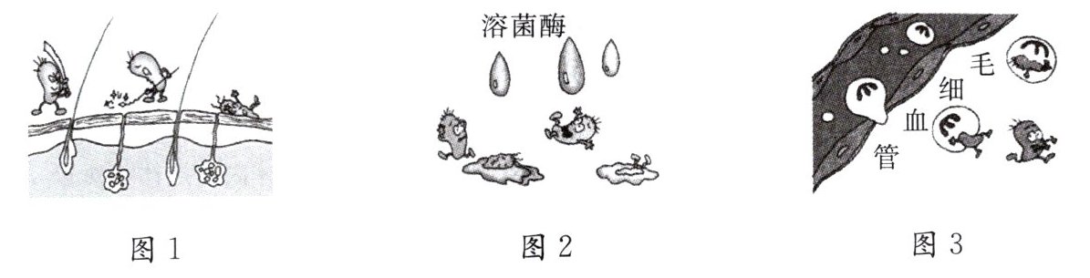 (2)若皮肤不慎被划伤,应急情况下,在伤口处涂抹适量唾液可起到一定的杀菌消炎作用,原因是唾液中含有____,其杀菌机理可用图____来形象地说明,这属于人体的第____道防线,
