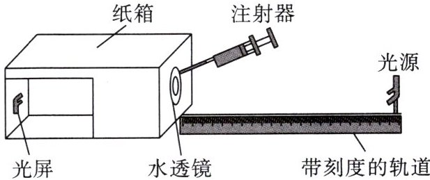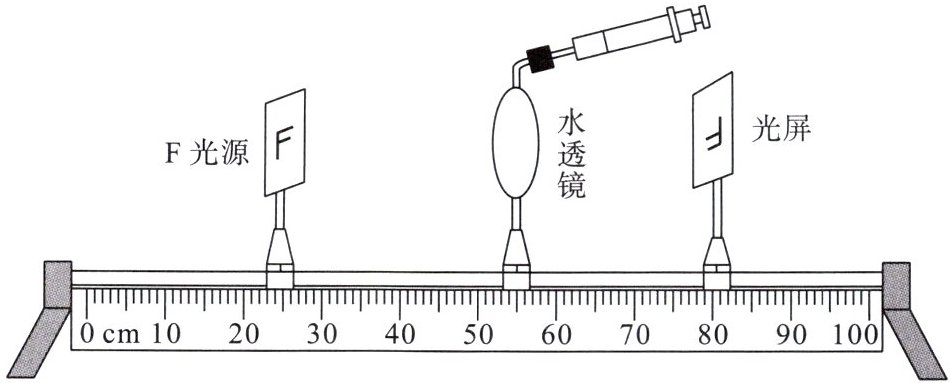 10. 在 STEM 学习中心,小雨与他的同学制作了一个可变焦的水透镜(向内推注射器,水透镜曲度变大;向外拉注射器,水透镜曲度变小),利用物理实验室的光具座及配件来模拟人的眼球成像过程(如图)。据图回答下列问题。