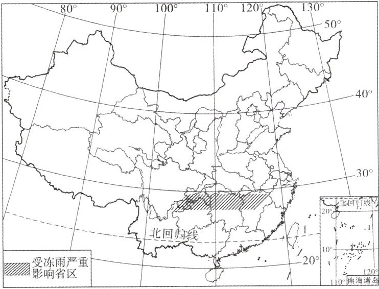 (2)受冻雨影响严重的省区分别是江西省、湖南省、______市、贵州省,从温度带的划分来看,这些省区都属于______带。