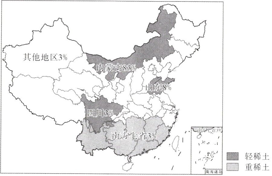 (1)我国稀土资源地区分布不均,北多南少;轻稀土主要分布于北方,重稀土主要分布于南方;北方集中分布于内蒙古和山东,南方分布较分散。