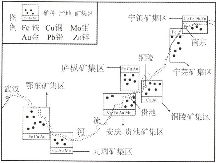 唐朝诗人李白曾多次到过秋浦(今安徽贵池)、铜陵等地。“炉火照天地,红星乱紫烟。赧郎明月夜,歌曲动寒川”是李白描写秋浦当时冶炼的劳动场景。读我国某河流中下游矿集区位置简图,回答8、9题。