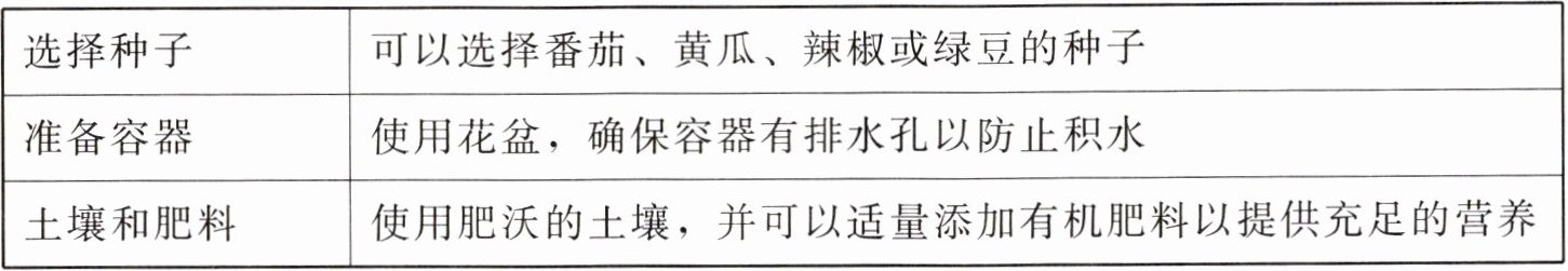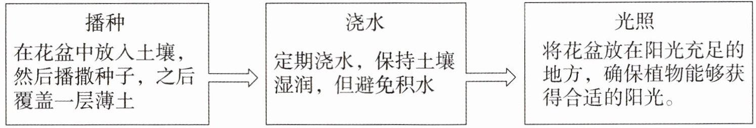 按照准备工作选择种子、容器、土壤肥料,按播种、浇水、光照的操作过程种植,定期观察记录植物生长情况,在实践中学习成长。