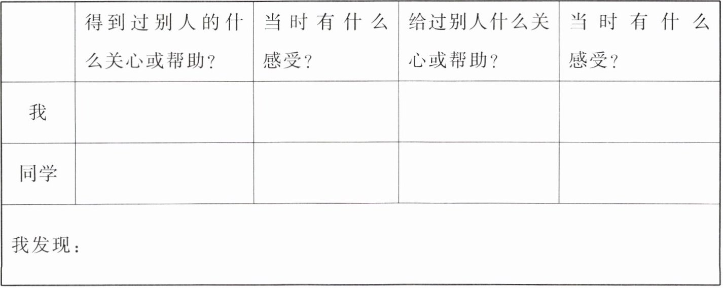| | 得到过别人的什么关心或帮助? | 当时有什么感受? | 给过别人什么关心或帮助? | 当时有什么感受? |