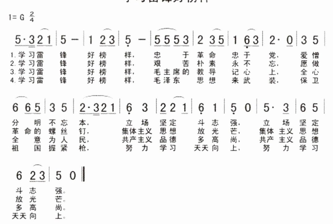 $\begin{array}{lllllllll}5 \cdot 321 & 5 - & 123 & 5 - & 5553 & 235 & 1 \underline{63} & 2 \cdot 0 & 35 \\1. 学习雷 & 锋 & 好榜 & 样, & 忠 & 于革 & 命忠 & 于党. & 爱憎 \\2. 学习雷 & 锋 & 好榜 & 样, & 忠 & 观艰 & 苦朴 & 素永 & 忘. \\3. 学习雷 & 锋 & 好榜 & 样, & 毛 & 主席 & 的教 & 导记 & 愿 \\4. 学习雷 & 锋 & 好榜 & 样, & 毛 & 泽东 & 思想 & 来武 & 做心 \\\end{array}\\ $