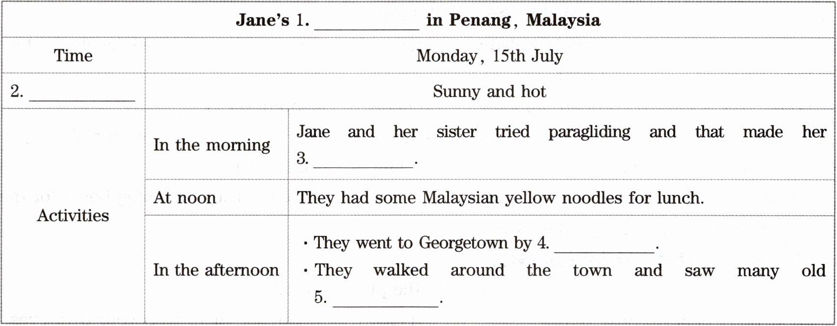 . Did she have fun?I arrived in Penang in Malaysia this morning with my family. It was sunny and hot, so we decided to go to the beach near our hotel. My sister and I tried paragliding. I felt like I was a bird. It was so