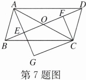 7. 如图,在$□ ABCD$中,对角线$AC$与$BD$相交于点$O$,$E$,$F$分别为$OB$,$OD$的中点,延长$AE$至点$G$,使$EG = AE$,连接$CG$。当$AB$与$AC$满足