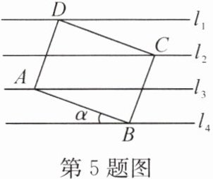 5. 如图,矩形 $ ABCD $ 的四个顶点分别在直线 $ l_3 $,$ l_4 $,$ l_2 $,$ l_1 $ 上,若直线 $ l_1 // l_2 // l_3 // l_4 $ 且间距相等,$ AB = 3 $,$ BC = 2 $,则 $ \tan \alpha $ 的值为(