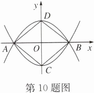 10. 如图,二次函数 $ y = ax^2 - 4 $ 和 $ y = -ax^2 + 4 $ 的图象都经过 $ x $ 轴上的 $ A $,$ B $ 两点,两图象的顶点分别为 $ C $,$ D $。当四边形 $ ACBD $ 的面积为 $ 40 $ 时,$ a $ 的值为