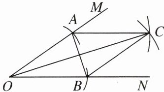 【例 1】(南阳模拟)如图,在∠MON 的两边上分别截取 OA,OB,使 OA=OB. 分别以点 A,B 为圆心,OA 长为半径作弧,两弧交于点 C. 连接 AC,BC,AB,OC. 若 AB=2 cm,四边形 OACB 的面积为 4 cm²,则 OC 的长为(