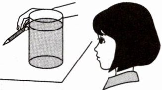 4. 找一个圆柱形的玻璃瓶,里面装满水,把一支铅笔水平地放在玻璃瓶的一侧,透过玻璃瓶,可以看到那支铅笔的形状