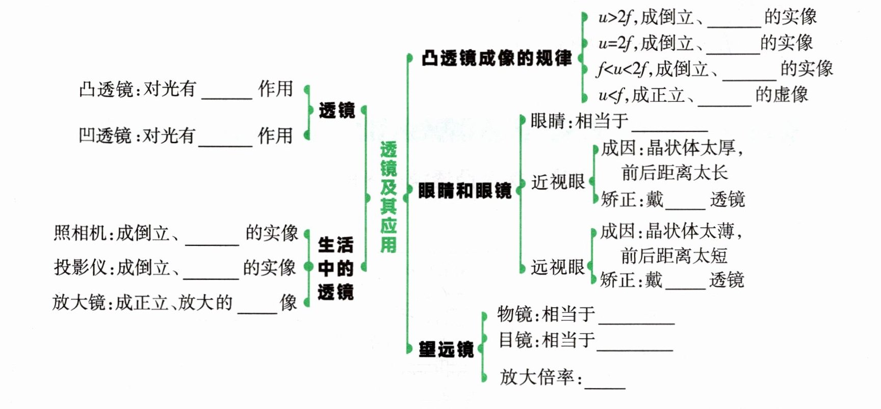 1.会聚 2.发散 3.缩小 4.放大 5.虚 6.缩小 7.等大 8.放大 9.放大 10.照相机 11.凹 12.凸 13.照相机 14.放大镜 15.$\frac{f_{物}}{f_{目}}$