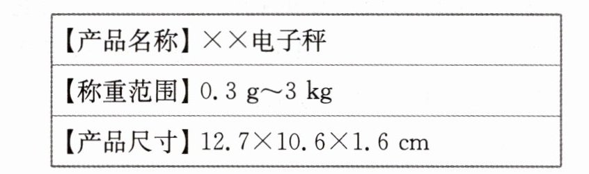 9. 小雯看到一个大头针盒,此盒已经使用了部分大头针,剩下一些规格相同的大头针如图甲所示。小雯很想知道剩下的所有大头针的数量,但不想直接人工去数,现有如图乙所示的某品牌的电子秤及与此电子秤相关的信息(称重范围是指电子秤能够测量的质量范围,通常以最大测量值和最小测量值来表示)。