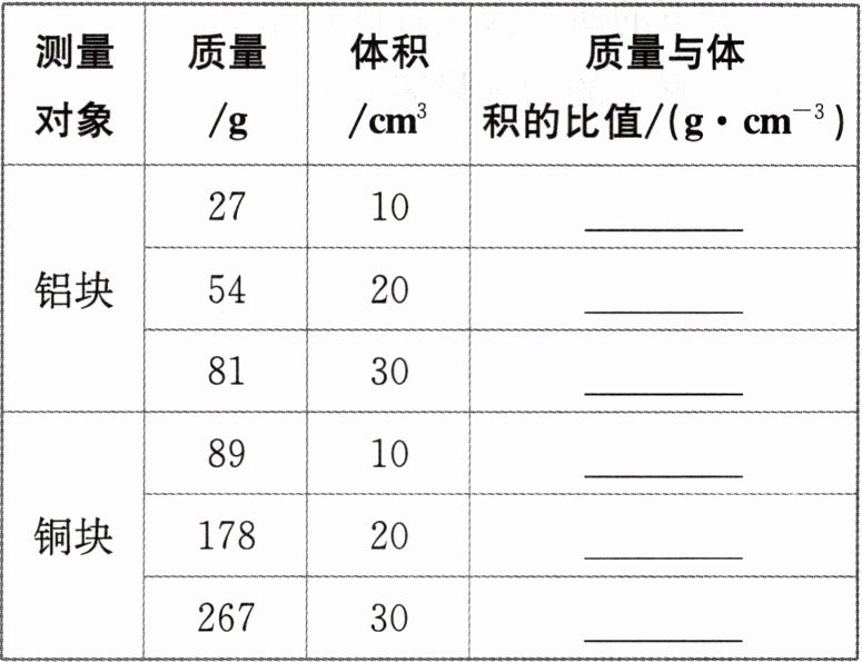 典例1(2025南京鼓楼区月考)小明为了探究物体的质量与体积的关系,选择大小不同的铝块和铜块进行实验。
