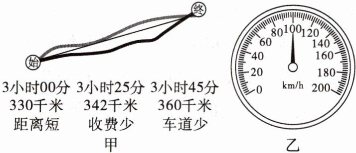 2. 国庆长假,小明一家从居住地自驾汽车到某景点游玩,导航给出了“距离短”“收费少”“车道少”三种方案,如图甲所示。