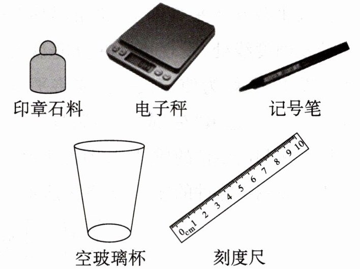 (1)实验步骤①用电子秤称出印章石料的质量$m_{1};$②将盛有适量水的玻璃杯放到电子秤上,称出总质量$m_{2}$,用细线系住石料浸没水中,用记号笔标出此时水面位置;③取出石料,向玻璃杯中加水至标记处,称出总质量$m_{3};$