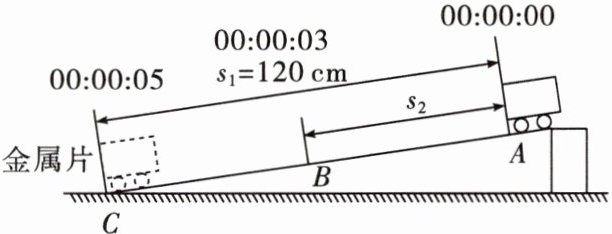 (选填“较大”或“较小”),这是为了减小测量时间造成的误差。(3)经测量,$s_1 = 120\ cm$,$s_2 = 60\ cm$,秒表记录如图所示,则小车在$BC$段上的平均速度是