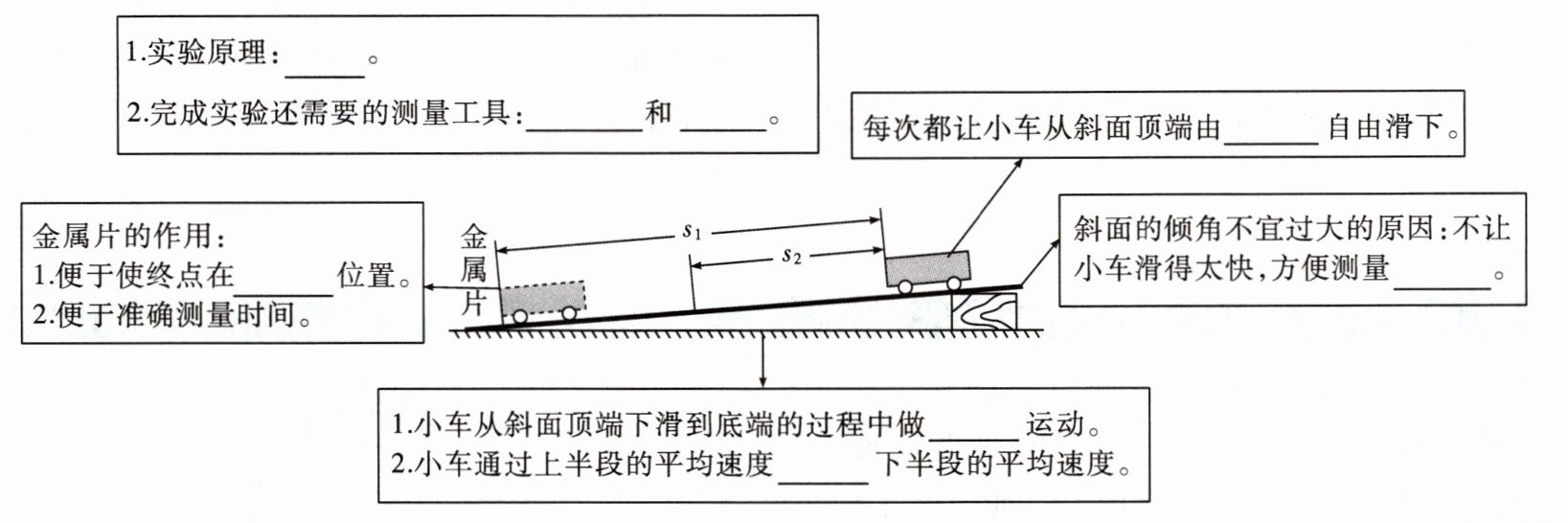 1.$v=\frac{s}{t}$ 2.刻度尺 秒表 静止 1.同一 时间 1.变速 2.小于