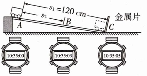 小明在做“测小车运动的速度”的实验中,设计了如图所示的实验装置,$A$、$B$、$C$三处电子表的显示数字分别表示“时:分:秒”。