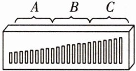 11. 创新实验 口琴是用嘴吹或吸气,使金属簧片振动发声的多簧片乐器,是一种自由簧气鸣乐器,它有上下两排小方格孔,装有多组自由振动的簧片,气流强迫通过时,灵活的金属舌簧振动发声,来回移动,吹吸不同的孔时可以发出不同音调的声音。如图所示是将口琴拆开后其内部的琴芯结构,在琴芯的气孔边分布着长短、厚薄都不同的一排铜片,A区的较薄、较短振动快,而C区的较长、较厚振动慢。