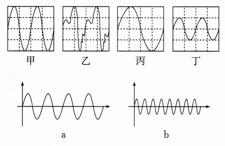9. 新教材样板题 学习了声音的特性后,小夏用示波器显示了几种声音的振动波形图,如图所示的甲乙丙丁中,根据波的特征分析可知: