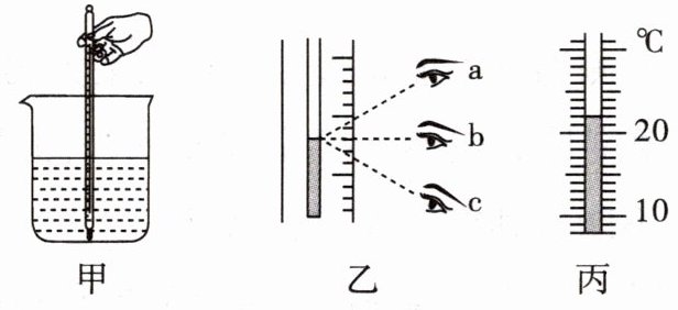 (选填“a”“b”或“c”)。(3)改正错误后,温度计的示数如图丙所示,则测得水的温度是