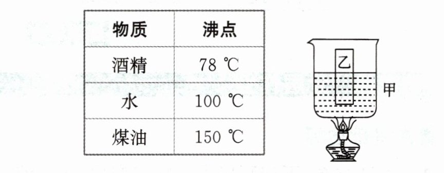 10. 科学思维 在图中,甲容器内盛有水,乙容器内盛有下表所列的一种液体(图未全画出)。在标准大气压下,若对甲容器的底部持续加热,发现乙容器内的液体发生沸腾,则乙容器内盛的液体是(