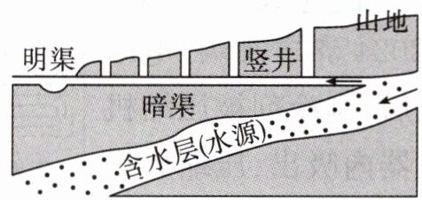 1. 教材样板题(多选)吐鲁番是全国有名的“火炉”,常年高温少雨,水贵如油。当地流行使用坎儿井,大大减少了输水过程中水的蒸发和渗漏。坎儿井由明渠、暗渠、竖井组成,如图所示。暗渠即地下水道,是坎儿井的主体,宽约$1.2\ m$。竖井的深度因地势和地下水位高低不同而有深有浅,最深的井可达$90\ m$以上,井内的水在夏季约比外界低$5\sim10^{\circ}C$。关于坎儿井,下列说法中正确的是(