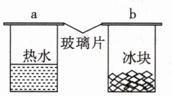 4. 如图所示,常温下两个烧杯分别盛有冰块和热水,上方分别盖有$a$、$b$玻璃片。过一会儿可明显看到(