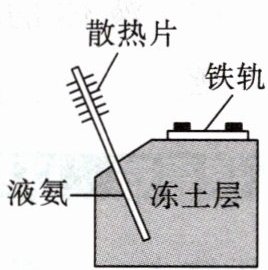 3. 物理学与工程实践 为保证青藏铁路多年冻土区路基的稳定性,铁路两侧安装了许多封闭的中空热棒。如图所示,热棒下端插在冻土中,内部填充低沸点的液态氨,利用氨的物态变化给冻土降温,把冻土中的热量“搬运到”热棒上端,通过散热片向空中放热,从而使冻土保持稳定。下列说法正确的是(