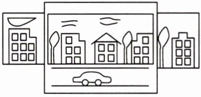 13. 用彩笔在一张窄长的硬纸片上画出房屋、树木和白云作背景,再在一张宽卡片的下方画上两条横线代表公路,在公路上画一辆汽车。