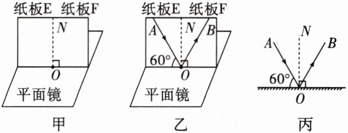 (1) 图乙中,用激光笔沿AO方向入射,当入射光线与平面镜夹角为${60}^{\circ }$时,入射角大小为