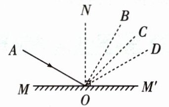 8. (2025泸州市江阳十五中期中)如图所示,MM'为平面镜,AO为入射光线,ON为法线,入射角$\angle AON= {60}^{\circ }。已知\angle BON= {30}^{\circ },$$\angle CON= {45}^{\circ },$$\angle DON= {60}^{\circ },$则入射光线AO的反射光线将沿着______(选填“OB”“OC”或“OD”)射出。当入射角增大${10}^{\circ }$时,反射光线将转动______。