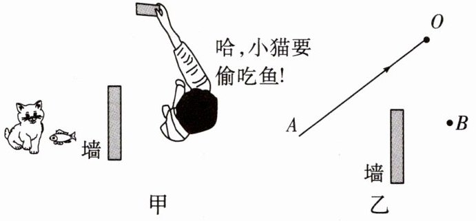 3. (2024 成都)如图甲所示,小孟利用一面小镜子隔墙看到院里的小猫要偷吃鱼。如图乙所示,AO 表示来自小猫的入射光线,O 点为入射点,B 点为小孟眼睛所在位置。请在图乙中完成作图: