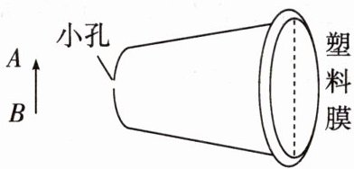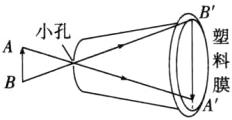 2. (2024 白银)如图所示是小强在纸杯上蒙上一层塑料膜做小孔成像实验的情景,请在图中作出烛焰(用 AB 表示)在塑料膜上成的像(用箭头 $ A'B' $ 表示)及光路图。