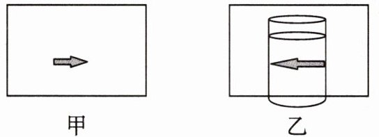 13. 如图甲所示的一张纸立在桌面上。小霞把一个装水的玻璃杯放在纸前,惊奇地发现:透过水杯看到纸中的箭头变长了,方向还改变了,如图乙。小霞观察分析:装水的圆柱形玻璃杯横切面中间厚,边缘薄,起到