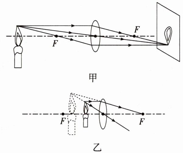 16. 小丽利用自己的家庭实验器材,探究了凸透镜成实像的情况,如图甲所示;又探究了凸透镜成虚像的情况,如图乙所示。针对小丽的探究结果,联系平面镜成像,请你总结实像和虚像的区别。