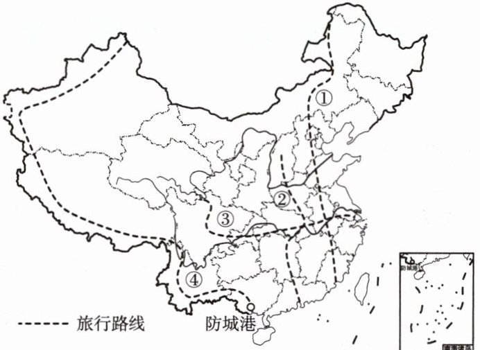 。(2)路线④的出发地是防城港,该地所属省级行政区是