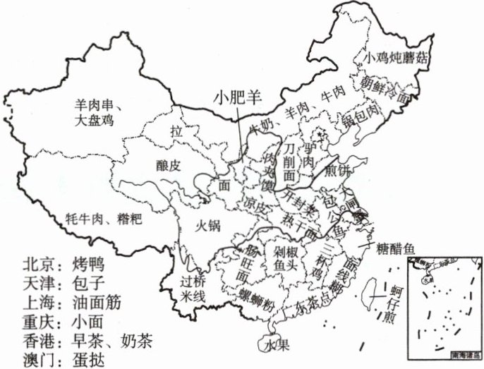 美食文化 下图为某同学在中国地图上填写的中国美食分布图。据此完成7~8题。
